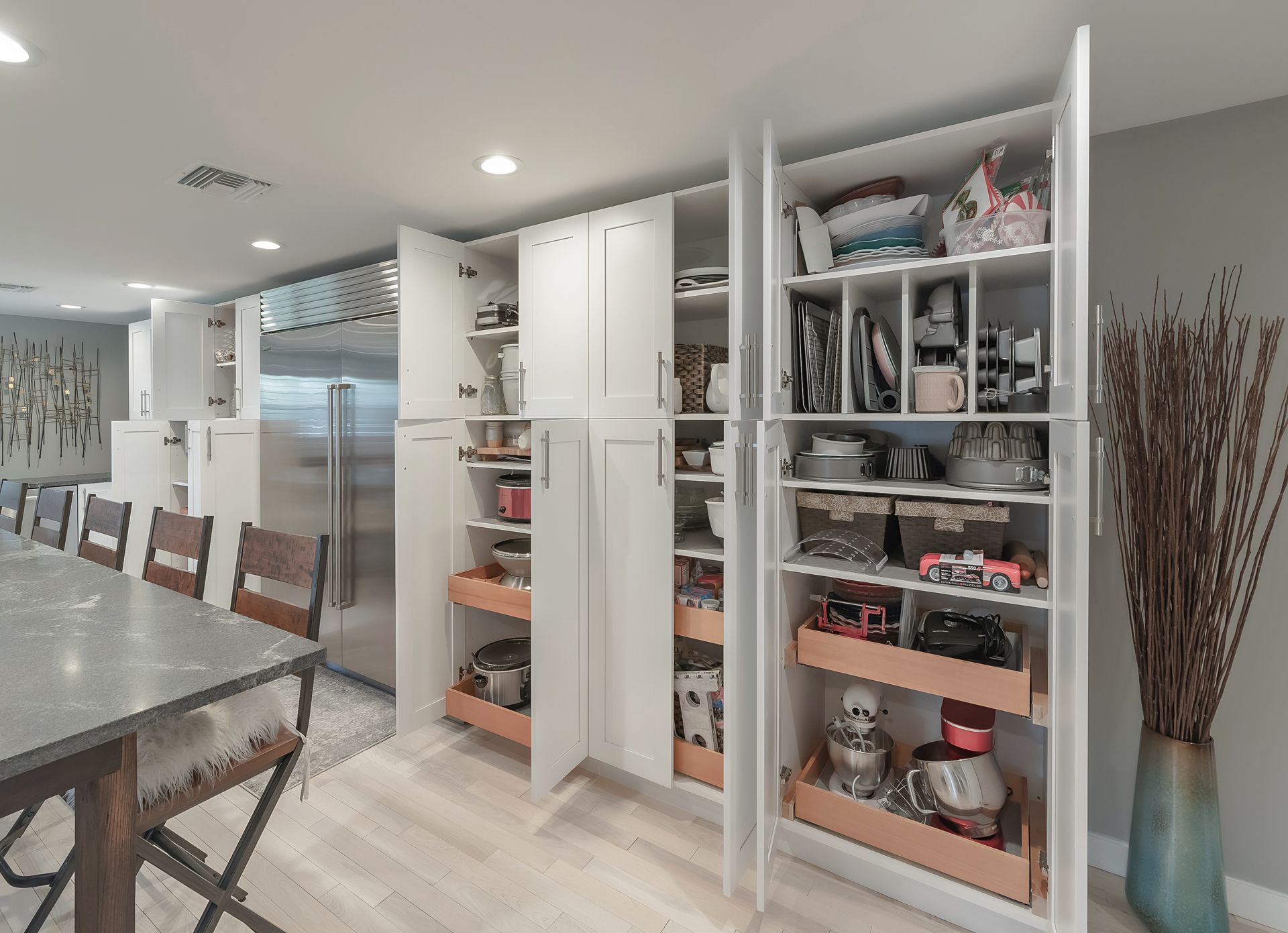 This kitchen is all about storage in a BIG way! A typical 1970’s Florida ranch with a modest kitchen was transformed into a 14x25 beautiful space via an expansive addition. The client opted to have an upper cabinet-free space, utilizing pantries which flank the sub-zero refrigeration unit. Pull out shelving in the pantries make access and ease. All of the drawers incorporate a peg system to house virtually any item in a neat and organized way! This kitchen is not only beautiful but utilizes storage in an extremely efficient way!